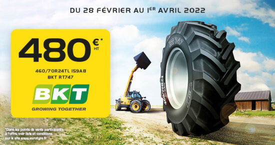 Du 28 février au 01 avril 2022, profitez du pneu agricole BKT 460/70R24TL 159A8 RT747 pour seulement 480€* H.T ! […]